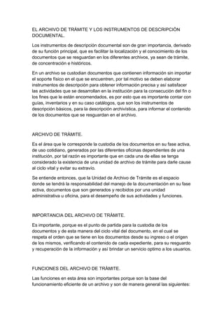 El documento describe las tres etapas del ciclo vital de los documentos: activa, semiactiva e inactiva. Explica que en la etapa activa los documentos se almacenan en el archivo de trámite, en la semiactiva en el archivo de concentración, y en la inactiva en el archivo histórico. También describe los valores primarios de los documentos y las funciones del archivo de trámite.
