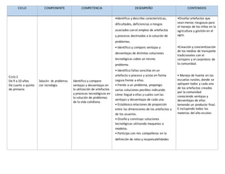El documento presenta los componentes, competencias y contenidos del ciclo 2 para los grados 4 y 5 de primaria. Se enfoca en temas como tecnología y sociedad, solución de problemas con tecnología, naturaleza y evolución de la tecnología, y apropiación y uso de la tecnología. Describe las habilidades que los estudiantes deben desarrollar en cada área como identificar efectos sociales de la tecnología, comparar ventajas y desventajas tecnológicas, y reconocer y utilizar