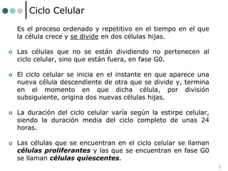 El documento describe los procesos de división celular de mitosis y meiosis. La mitosis produce dos células hijas idénticas y ocurre en todas las células somáticas, mientras que la meiosis reduce la cantidad de cromosomas a la mitad y produce gametos como óvulos y espermatozoides para la reproducción sexual. El ciclo celular completo dura unas 24 horas e incluye las fases de interfase (G1, S, G2) y mitosis (profase, metafase, anafase y telofase).