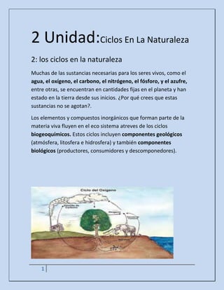 Las sustancias esenciales para la vida como el carbono, oxígeno, nitrógeno y otros elementos se mueven continuamente a través de los ciclos biogeoquímicos entre los componentes geológicos (atmósfera, litosfera e hidrosfera) y biológicos (productores, consumidores y descomponedores), lo que mantiene las cantidades de estas sustancias relativamente constantes a pesar de su uso continuo por los seres vivos. En particular, el carbono y el oxígeno forman parte integral de mol