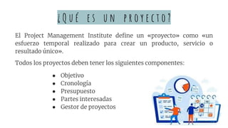 El documento describe las diferentes etapas del ciclo de vida de un proyecto, incluyendo la iniciación, planeación, ejecución, control, mejora continua y cierre. Explica que cada etapa incluye actividades clave como definir objetivos, desarrollar un plan maestro, crear un equipo de trabajo, realizar un seguimiento y hacer ajustes, y entregar el producto, servicio o resultado final al cliente.