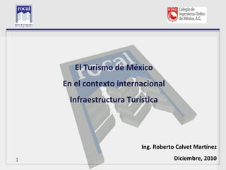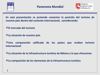 El documento describe la posición del turismo en México en el contexto internacional. Analiza las inversiones turísticas privadas en México, señalando que la mayoría proviene de capital nacional. También examina los principales estados receptores de inversión turística privada. Finalmente, resume los pilares y subtemas que el Foro Económico Mundial evalúa para medir la competitividad turística de los países.