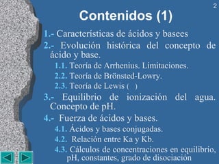 Este documento presenta los conceptos fundamentales sobre ácidos y bases. Explica las teorías de Arrhenius, Brönsted-Lowry y Lewis sobre la definición de ácidos y bases. También describe el equilibrio de ionización del agua, la definición de pH, las propiedades de ácidos y bases fuertes y débiles, y los cálculos relacionados con las concentraciones iónicas y el pH en soluciones acuosas.