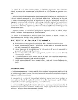 El ácido nítrico es un líquido incoloro y corrosivo que se descompone lentamente expuesto a la luz. Es uno de los ácidos más fuertes y se caracteriza por su poder oxidante sobre metales y sustancias orgánicas. Tiene aplicaciones importantes en industrias como fertilizantes, explosivos y medicamentos. Su contacto puede causar quemaduras graves en la piel, ojos y mucosas, e inhalación puede producir edema pulmonar e intoxicación aguda.
