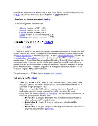 Los ácidos nucleicos son polímeros formados por la repetición de nucleótidos unidos mediante enlaces fosfodiéster. Almacenan la información genética de los organismos y son responsables de la transmisión hereditaria. Existen dos tipos básicos, el ADN y el ARN. El ADN contiene la información genética mientras que el ARN expresa esa información.