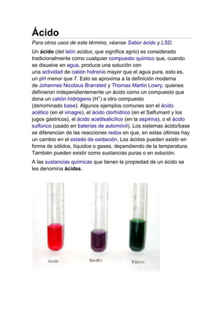 Este documento define un ácido como un compuesto químico que produce una solución acuosa con un pH menor que 7, donando un catión hidrógeno a otra sustancia. Menciona algunos ejemplos comunes de ácidos como el ácido acético en el vinagre, el ácido clorhídrico en el jugo gástrico y la aspirina, y el ácido sulfúrico en las baterías de automóvil. También señala que los ácidos pueden existir como sólidos, líquidos o gases dependiendo de la temperatura