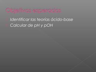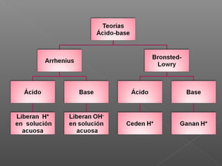 El documento describe las teorías ácido-base, incluyendo la definición de ácidos, bases, electrolitos fuertes y débiles. Explica cómo se calculan el pH y pOH de una solución, y cómo determinar si una solución es ácida, básica o neutra. También cubre los cálculos relacionados con la concentración de iones H+ e OH- y ejemplos de reacciones ácido-base.