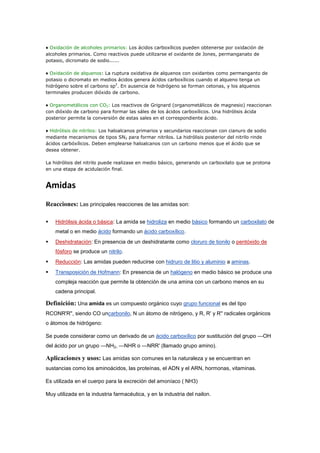 El documento describe las propiedades y reacciones de los ácidos carboxílicos y sus derivados. Los ácidos carboxílicos contienen un grupo carboxilo y reaccionan para formar sales, amidas, anhídridos y haluros de acilo. Sus derivados incluyen amidas, que contienen un grupo amino en lugar del grupo hidroxilo; anhídridos de ácido formados por deshidratación; y haluros de acilo donde el grupo hidroxilo es reemplazado por un halógeno.