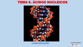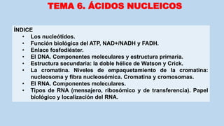 El documento describe los componentes y estructura del ADN. Explica que el ADN está formado por la unión de desoxirribonucleótidos que contienen desoxirribosa y las bases adenina, guanina, citosina o timina. El ADN puede disponerse en forma lineal o circular y almacena la información genética necesaria para el desarrollo de un organismo a través de la secuencia de sus bases nitrogenadas.