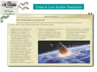 El documento describe el descubrimiento de precursores de ácidos nucleicos en un meteorito que cayó en Australia en 1969. Esto sugiere que parte de los materiales necesarios para la formación del ADN y ARN en la Tierra podrían haber llegado del espacio. Se encontraron uracilo y xantina, precursores de los ácidos nucleicos. Los autores creen que esto proporciona nuevas pistas sobre el origen de la vida, ya que meteoritos similares podrían haber aportado material orgánico necesario hace miles de millones de años.