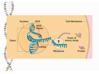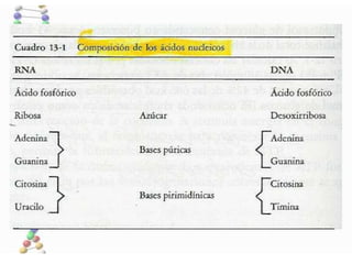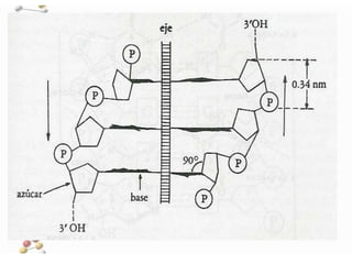 Los ácidos nucleicos están formados por cadenas de nucleótidos compuestos por azúcares, bases nitrogenadas y ácido fosfórico. El ADN se encuentra en el núcleo donde forma los cromosomas y transmite la información genética de generación en generación a través de su estructura en doble hélice. El ARN participa en la síntesis de proteínas y existe en distintos tipos como el ARN mensajero, de transferencia y ribosomal.