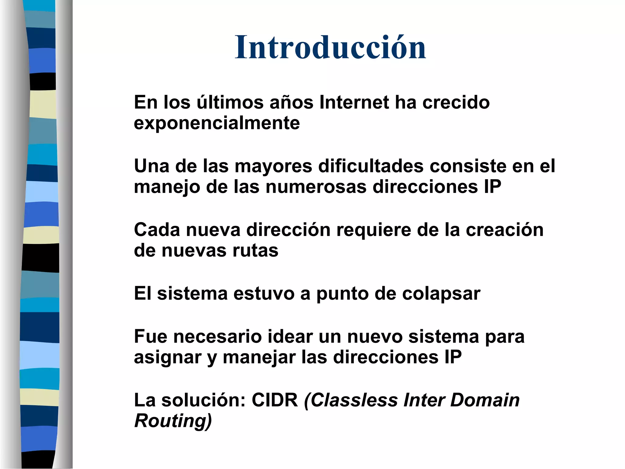 CIDR (Classless Inter-Domain Routing) es un sistema para asignar y manejar direcciones IP de forma más eficiente. CIDR permite el uso de prefijos de red de tamaño variable en lugar de limitarse a las clases tradicionales, agrupando bloques de direcciones existentes. Esto reduce el tamaño de las tablas de ruteo y jerarquiza las rutas entre dominios para una mejor administración de las direcciones IP disponibles a medida que Internet continúa creciendo.