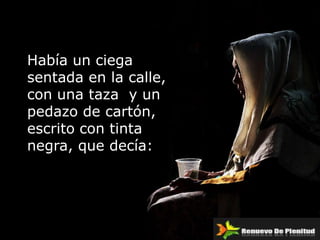 Un creativo de publicidad cambió el letrero de una ciega mendiga para mejorar sus ganancias. Donde antes decía solo "Ciega", el nuevo letrero incluía frases motivadoras sobre el cambio y los resultados, lo que llenó la taza de la ciega con billetes y monedas para el final del día.