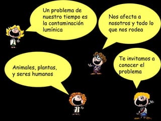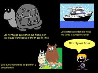 La contaminación lumínica afecta negativamente a los animales, plantas y seres humanos. Las tortugas marinas pierden sus huevos y crías debido a la luz en las playas, los barcos pueden chocar al no ver los faros por la contaminación lumínica y las aves nocturnas se desorientan. Todos podemos ayudar a reducir la contaminación lumínica apagando las luces innecesarias, observando el cielo y enviando informes para crear conciencia sobre este problema ambiental.