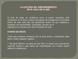 El documento describe las herramientas y cualidades necesarias para los estudiantes para construir su proyecto de vida. La escuela proporciona las primeras herramientas, como el entusiasmo, la creatividad, la receptividad y la organización. Un líder emprendedor inspira a otros a través de sus creencias y solucionando nuevas necesidades con innovación.