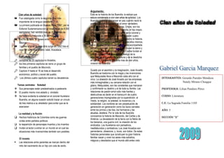 El documento describe el boom latinoamericano, un movimiento literario de los años 1960 y 1970 influenciado por autores como Julio Cortázar, Carlos Fuentes, Mario Vargas Llosa y Gabriel García Márquez. Incluye una biografía de García Márquez que destaca su educación y carrera periodística, así como aspectos clave de su novela Cien Años de Soledad como su estructura, temas, personajes e historia de la familia Buendía a lo largo de cuatro generaciones.