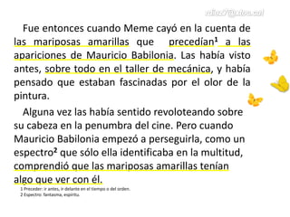 En este fragmento de 'Cien años de soledad', Meme se da cuenta de que las mariposas amarillas están relacionadas con Mauricio Babilonia, quien la sigue de cerca. Al experimentar una serie de eventos relacionados con las mariposas, Meme siente una conexión especial, aunque su madre, Fernanda, desconfía de Babilonia. La historia sugiere la existencia de un vínculo mágico y trágico entre los personajes y los símbolos naturales presentes.