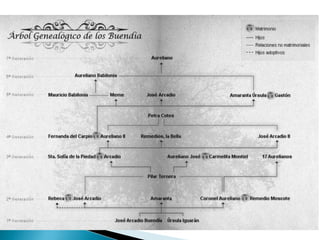 La novela narra la historia de la familia Buendía a lo largo de siete generaciones en el pueblo de Macondo. José Arcadio Buendía y Úrsula Iguarán fundan el pueblo y tienen tres hijos. Macondo crece pero también enfrenta la peste del olvido y del insomnio. El coronel Aureliano Buendía lucha en las guerras civiles y regresa a dedicarse a la fabricación de pescaditos de oro. La llegada del tren genera un auge económico en Macondo que termina