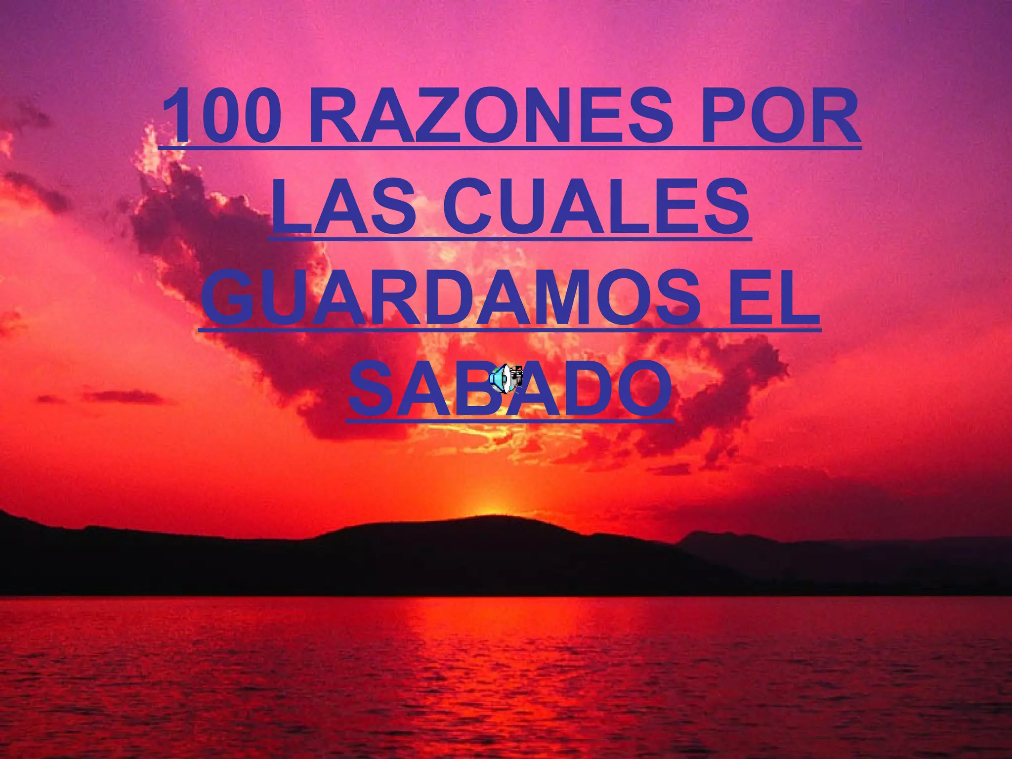 El documento proporciona 100 razones bíblicas para guardar el sábado (séptimo día de la semana) en lugar del domingo. Enumera 60 hechos bíblicos que muestran que el sábado fue instituido por Dios en la creación, bendito y santificado por Él, y guardado por Jesús, los apóstoles y los cristianos del Nuevo Testamento. Luego enumera 40 hechos que muestran que el domingo nunca fue instituido, bendecido o guardado como día de reposo por Dios o los cr