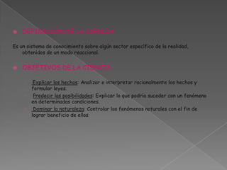Este documento proporciona una introducción a la ciencia. Define la ciencia como un sistema de conocimiento obtenido de manera empírica para explicar los hechos de la naturaleza. Explica que la ciencia tiene los objetivos de explicar los hechos, predecir posibilidades y dominar la naturaleza. Además, clasifica las ciencias en formales, naturales y sociales y discute conceptos como leyes, teorías y sistemas científicos.