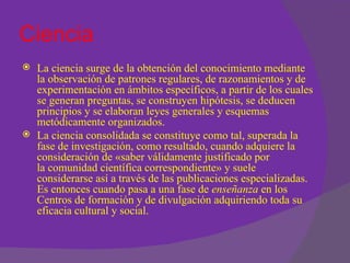 El documento describe la ciencia, sus métodos y clasificaciones. Explica que la ciencia surge de la observación sistemática y experimentación para generar conocimiento objetivo. Se valida a través de la comunidad científica y se enseña en centros educativos. Se clasifica en ciencias formales, naturales y sociales. También habla sobre tecnología, herramientas, procesos de invención y la sociedad.
