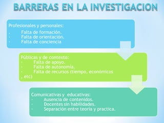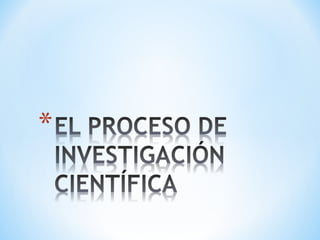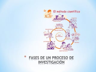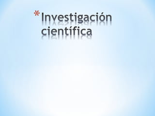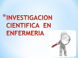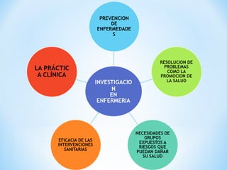 El documento describe el proceso de investigación científica. Explica que la investigación científica es un proceso sistemático que implica varias fases como la planeación, ejecución y evaluación-comunicación de resultados. También define la investigación como un medio para crear y mantener una sólida base científica para la práctica profesional y mejorar los resultados en la atención de salud.