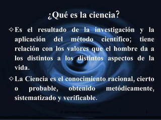 La ciencia es el conocimiento racional obtenido a través del método científico, que incluye la observación sistemática y la experimentación para verificar hipótesis. La ciencia trata de explicar fenómenos materiales de manera realista y racional a través de enunciados empíricos y teorías generales. Existen ciencias puras como la lógica y las matemáticas, así como ciencias aplicadas que estudian la realidad social y natural para comprenderla y predecirla.