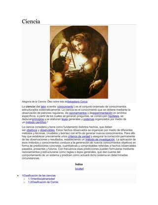 El documento describe la ciencia como el conjunto ordenado de conocimientos estructurados sistemáticamente que se obtienen mediante observación, experimentación y razonamiento. Explica que la ciencia considera hechos objetivos que se organizan en teorías y modelos para generar nuevos conocimientos mediante un método científico. También clasifica las ciencias en formales, naturales y sociales.