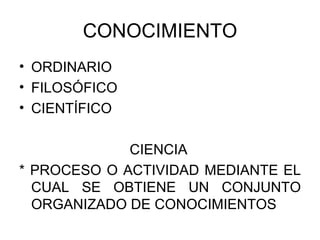 El documento describe la evolución del conocimiento científico desde la antigua Grecia hasta la época moderna. Comienza con Sócrates, Platón y Aristóteles que sentaron las bases de la filosofía y el razonamiento lógico. Luego, durante la Edad Media el conocimiento se centró en la teología. El Renacimiento trajo el enfoque en el ser humano y el método científico experimental. Figuras como Copérnico, Galileo y Descartes further desarrollaron el razonamiento deductivo e inductivo. La Ilustración popular