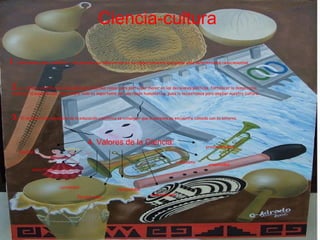 El documento discute la importancia de la cultura científica. Señala que una persona con conocimientos científicos puede ser considerada científica. Explica que la cultura científica es necesaria para participar en decisiones políticas, fortalecer la democracia y reducir la superstición. Además, amplía nuestra cultura general de forma humanística. El objetivo más inmediato de la educación científica es que las personas se sientan cómodas en su entorno. Finalmente, enumera valores como la curiosidad, el escept