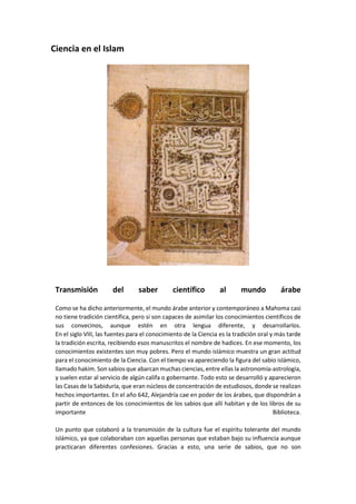 El documento describe la transmisión del conocimiento científico al mundo árabe desde la antigüedad. Los árabes asimilaron los conocimientos de sus vecinos a pesar de las diferencias lingüísticas. Con la caída de Alejandría en el siglo VIII, tuvieron acceso a importantes bibliotecas y manuscritos griegos que tradujeron al árabe. Este conocimiento se expandió a través de las Casas de la Sabiduría y el trabajo de traductores como al-Khwarizmi. La astronomía se desar