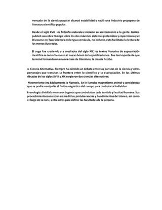 La relación entre la ciencia y la cultura popular ha existido desde la Revolución Científica en los siglos XVI y XVII. A lo largo de los siglos, los científicos encontraron varias formas de comunicarse con el público, incluyendo conferencias, exposiciones, publicaciones y ciencia alternativa. Actualmente, aunque algunos científicos creen que involucrarse con la cultura popular trivializa la ciencia, la relación se considera una interacción constante y recíproca.