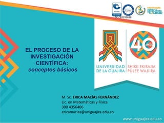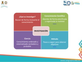 Este documento describe los conceptos básicos de la investigación científica. Explica que la investigación científica implica buscar el conocimiento de forma planificada y sistemática mediante el uso de métodos. Compara el conocimiento común frente al conocimiento científico, señalando que este último es objetivo, preciso, universal y se basa en la comprobación y verificación a través de métodos, técnicas e instrumentos. Además, presenta los métodos inductivo, deductivo e hipotético-deductivo como formas de obtener conoc