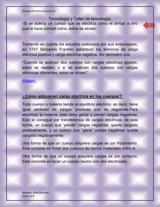Este documento resume las propiedades eléctricas de la materia. Explica que la electricidad se produce cuando los materiales como el ámbar se frotan, y que existen dos tipos de cargas eléctricas: positiva y negativa. También describe cómo los átomos adquieren una carga a través de la transferencia de electrones, y cómo la fuerza eléctrica según la ley de Coulomb causa que las cargas similares se repelan y las cargas opuestas se atraigan.
