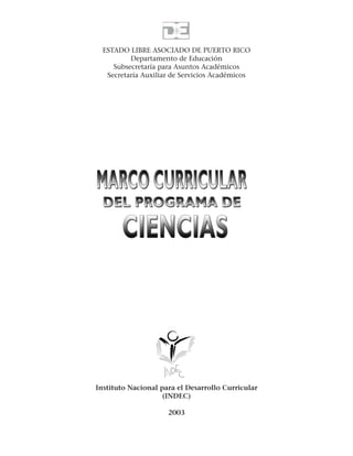 Este documento presenta el Marco Curricular del Programa de Ciencias en Puerto Rico. Establece la misión y metas del programa, las cuales buscan desarrollar valores y satisfacer necesidades educativas de los estudiantes relacionadas a las ciencias naturales. Describe la perspectiva interdisciplinaria de las ciencias y cómo se construye el conocimiento en las diferentes disciplinas que componen el programa. Finalmente, detalla los contenidos, objetivos, estándares y enfoque del programa para cumplir con su misión de educar estudiantes con sólidos conocimientos científ