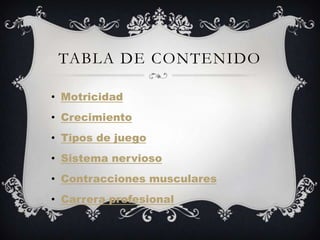 Este documento presenta una introducción a las ciencias del deporte. Explica conceptos clave como la motricidad, el crecimiento, los tipos de juego, el sistema nervioso y las contracciones musculares. También describe una carrera profesional en ciencias del deporte, incluyendo detalles sobre el nivel de formación, título, duración, código, sede, registro calificado, dirección, teléfonos, decano, correo electrónico, misión, visión y objetivos.