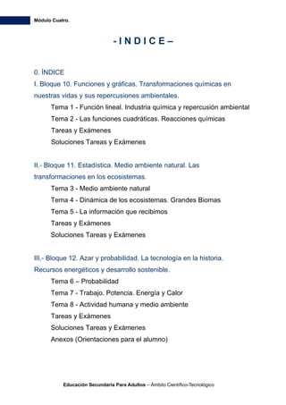 Este documento presenta un módulo educativo para adultos en el ámbito científico y tecnológico. El módulo contiene 12 bloques que cubren temas como funciones, estadística, probabilidad, química industrial y su impacto ambiental, y recursos energéticos. Cada bloque incluye varios temas con lecciones, actividades y exámenes. El documento proporciona un índice detallado de los contenidos cubiertos en el módulo.