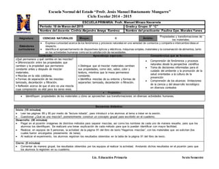 Este documento presenta una lección sobre las propiedades y transformaciones de los materiales. La lección se enfoca en diferenciar las propiedades que cambian y las que permanecen constantes al mezclar materiales, identificar mezclas en la vida cotidiana y sus métodos de separación como tamizado, decantación y filtración. La secuencia didáctica incluye actividades como observar un video, trabajar en equipos para analizar la composición del aire, y crear un mapa mental sobre métodos de separación de mezclas.