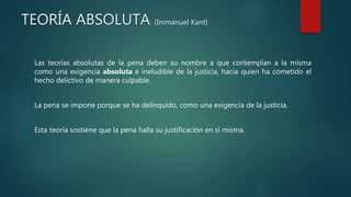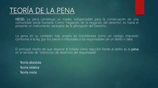 Este documento presenta diferentes teorías sobre la pena, incluyendo teorías absolutas, relativas y mixtas. La teoría absoluta sostiene que la pena se impone como una exigencia de justicia por el delito cometido. La teoría relativa ve a la pena como un instrumento para prevenir delitos futuros mediante la intimidación o rehabilitación. Las teorías mixtas asignan a la pena el objetivo de proteger a la sociedad, aunque de manera diferente. Finalmente, el documento discute los sistemas para determinar la