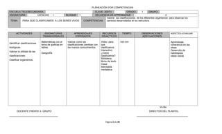 Este documento presenta un plan de estudios para la asignatura de Ciencias del primer grado de secundaria. El plan incluye cuatro temas principales sobre biodiversidad y ecosistemas, así como las competencias, actividades, recursos y aspectos a evaluar para cada tema.