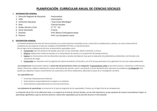Este documento presenta la planificación curricular anual de Ciencias Sociales para el tercer grado de secundaria en una institución educativa en Huancavelica, Perú. La planificación incluye información general, una descripción general del área y sus competencias, una calendarización general dividida en trimestres, y una matriz de desempeños por competencias. El objetivo principal del área es desarrollar la identidad social y cultural de los estudiantes y competencias para la ciudadanía activa a través de capacidades como comprender el pasado e historia del Per