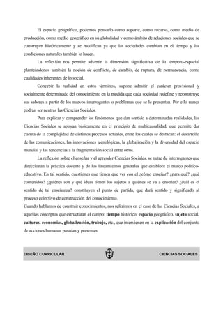 Este documento describe los fundamentos y contenidos de las Ciencias Sociales en la Educación General Básica. Se explica que las Ciencias Sociales estudian la compleja realidad social desde múltiples perspectivas disciplinarias. Los contenidos se organizan en torno a tres ejes: 1) los sujetos y la construcción del espacio social, 2) los sujetos y la construcción de la memoria e identidad colectiva, y 3) los sujetos, el trabajo y la construcción de relaciones sociales. El documento también presenta las expectativas de aprendizaje para el primer cic