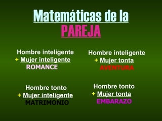 El documento presenta varios principios científicos aplicados a las relaciones de pareja y la vida laboral, como que las parejas formadas por personas inteligentes tienden a tener más éxito romántico o en el trabajo, mientras que las parejas de personas menos inteligentes enfrentan más desafíos; también explora conceptos como las discusiones entre hombres y mujeres y cómo los hombres casados viven más que los solteros.