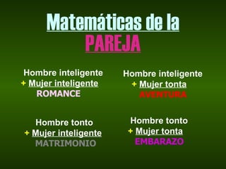 El documento presenta varios principios científicos aplicados a las relaciones de pareja y la dinámica entre hombres y mujeres. Incluye fórmulas matemáticas sobre el romance, el matrimonio y el embarazo según la inteligencia de cada persona. También expone algoritmos sobre las compras y ecuaciones sobre la felicidad en una relación y la longevidad de los hombres casados versus solteros. Finalmente, describe técnicas de discusión y el principio de acción y reacción aplicable a cuando se pregunta a alguien sobre