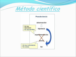 Este documento contrasta la ciencia y la pseudociencia. Define la ciencia como un conocimiento sistemático basado en la observación, experimentación y verificación empírica, mientras que la pseudociencia carece de un método científico válido y no puede ser verificada de forma confiable. Luego describe las características de la ciencia como trascendente, analítica, especializada, precisa, comunicable, empírica, metódica y abierta, entre otras. Finalmente, distingue a la pseudociencia por no aplicar una metodología c