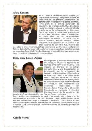 El documento presenta información sobre varios científicos e investigadores colombianos destacados en diferentes campos como la astronomía, microbiología, ingeniería, matemáticas y medicina. Entre ellos se encuentran Adriana Ocampo, primera astronauta colombiana; Ángela Restrepo, reconocida microbióloga; y Camilo Mora, biólogo que ha contabilizado el número de especies animales en el planeta.