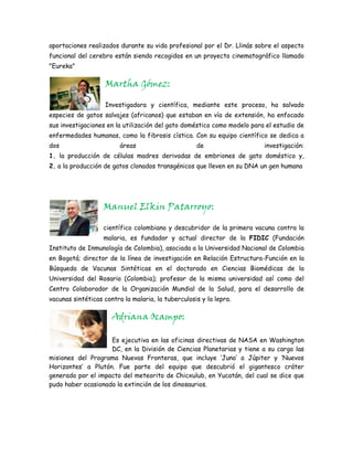 Este documento presenta breves biografías de destacados científicos e investigadores colombianos que han realizado importantes contribuciones en campos como la medicina, la biología, la neurociencia, la astronomía, la física, la ingeniería y la antropología. Entre ellos se encuentran Salomón Hakim Dow, inventor de una válvula para tratar la hidrocefalia; Raúl Cuero, desarrollador de una sustancia que genera resistencia en plantas; y Rodolfo Llinás, conocido por sus aportes a