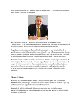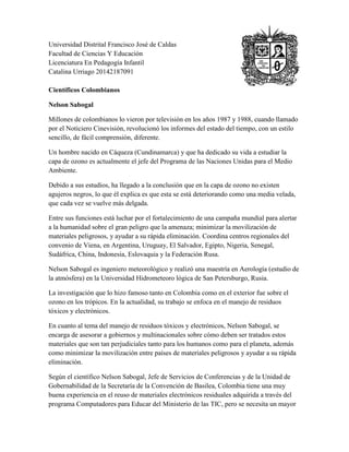 Los documentos presentan información sobre varios científicos e investigadores colombianos destacados como Nelson Sabogal, Martha Gómez, Raúl Cuero, Eduardo Posada Flórez y Ángela Restrepo Moreno. Nelson Sabogal es el jefe del Programa de las Naciones Unidas para el Medio Ambiente y se ha dedicado al estudio de la capa de ozono y los residuos tóxicos. Martha Gómez es una experta mundial en clonación que ha clonado el primer gato salvaje. Raúl Cuero es un inventor galardonado con