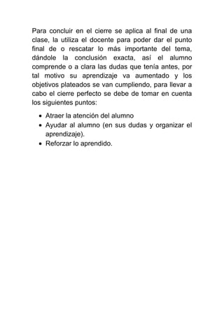 El documento describe el propósito y la importancia del cierre al final de una clase. El cierre permite al docente resumir lo más importante del tema y brindar una conclusión clara para que los estudiantes comprendan mejor y aclaren cualquier duda. Al aplicar un buen cierre, se ayuda a los estudiantes a organizar su aprendizaje y a reforzar lo que aprendieron, cumpliendo así con los objetivos de la clase.