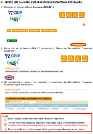 El documento proporciona instrucciones para maestros y directores sobre tareas administrativas de fin de año escolar y comienzo del próximo año, incluyendo la confección de actas de promoción, indicación de alumnos con necesidades educativas especiales, cierre del año lectivo, actualización de docentes, verificación de cierre y apertura de grupos, y completado de datos para el REA 2014.